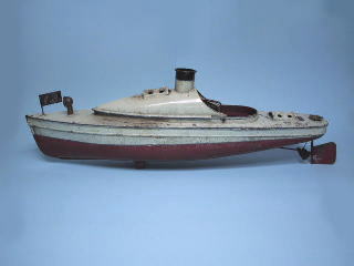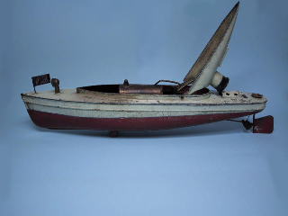 戦前?のブリキの船です。オシレーティングエンジン(首振りエンジンと言うべきか)で動く高級なおもちゃです。残念ながらバーナーが欠品ですが、単純なあぶりバーナーでしょう。かなり遊んだらしく船内はすすけています。この船のすばらしさはこの外観です。流線型という言葉がぴったりで、昭和初期の流線型ブームに作られたものと推測しています。(満州鉄道の特急亜細亜号が目に浮かびます?) メーカー名かどうかは不明ですが、後部にASAHI