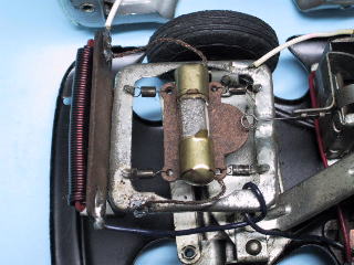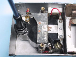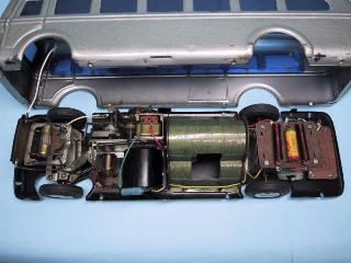 無論、真空管もトランジスタも使われていません。一番右の写真が送信機の内部ですが押しボタンを押すとバイブレータが働いて、アンテナ付根に上に見えるギャップ間で放電が起こります。この火花放電により発生する電波でコントロールします。受信は真中の写真に見えるコヒーラが受け持ちます。コヒーラはガラスの管に金属の粉が封じ込まれていて、両側に電極が付いています。コヒーラに受信した電波による高周波電流が流れると電極間が導通して電流が流れるようになります。このままだと電流が流れっぱなしになるので、コヒーラの右にあるハンマーで叩くいて、金属紛に振動を与えると電流が流れなくなります(デコヒーラ)。電波を受けてコヒーラが導通する度、順番に直進、右旋回、直進、左旋回、停止を繰り返すようにモーターとカムでシーケンサーを作っておけば、立派に無線操縦できます。但し、毎回コヒーラの導通状態を解除する必要があるので、あまり早く操作することはできません。コヒーラ自体はマルコーニやポポフも使った古い技術ですが、昭和30年にその技術を用いて、無線操縦のおもちゃを完成させた発想と熱意はすばらしいものです。