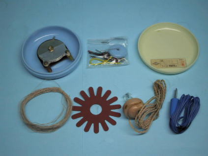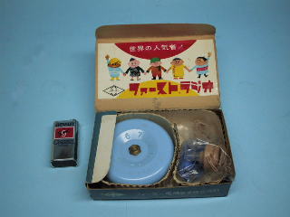 空飛ぶ円盤型ゲルマラジオキットです。説明書などから’60年代初め頃の物と推測されます。蚤の市で見つけました。ゲルマラジオキットは非常に珍しくかなり高価だったのですが衝動買いしてしまいました。アンテナコイルはスパイダーコイルで絹巻き線?を巻いて作ります。ポリバリコンも見なれない形状のものです。ロッシェル塩?タイプのクリスタルイヤホンだけでも価値があります。右下は電灯線アンテナで青いプラスチック部分の中に100pFのコンデンサが入っています。これをコンセントに挿してアンテナとします。昔のゲルマラジオ、1石ラジオにはよくこれが付いていました。
