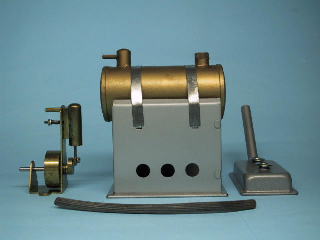 科学教材社より発売されていたオシレーチングエンジンです。子供の科学で有名な科学教材社から30年ぐらい前より発売されていました。子供の頃欲しかったのですが、最近在庫品が格安で売り出されていましたので衝動買いしてしまいました。ボイラーの安全弁は無いのでゴムホースでエンジンと繋いで代用しています。今では環境物質である石綿がバーナーの芯に使われています。
