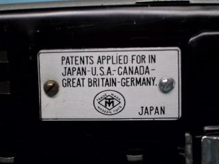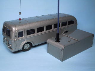 昭和30年に増田屋より売り出されたラジコンバスです。「ラジコン」という言葉もこのおもちゃから始まりました。今でもちゃんと動きます。操作は順序式で1回ボタンを押す度に直進、右旋回、左旋回、停止を繰り返します。何しろトランジスタラジオがやっと世に出始めた年にこんなおもちゃが出現したのですから驚きです。右の写真のようにおもちゃのくせに世界各国で特許を取得しています。