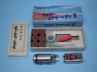 1970年代の模型用ロケットエンジン、タイガー製作所のロケッティB型です。固形燃料のロケットエンジンでA,Bの2タイプありました。全長55mm,重量24g,静止推力50g、燃焼時間18秒とフリーフライトの飛行機を飛ばすには魅力的な性能です。どこかのメーカで再生産してくれませんかね?イギリスには似たロケットエンジンが今でも有るらしいです。そのうち小型のラジコン機でも作って乗せてみたいエンジンです。
