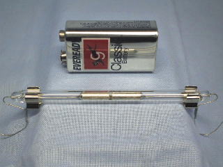 コヒーラ?らしき物を入手しました。ガラス管の中に銀メッキ?されているような電極があってキャップに金属紛が封入されています。長さは約10cm、ガラス管径は6mmです。電極部の直径は約4mm、ギャップはV字状で狭い側は0.8mm、広い側は1.5mm程度で、金属紛はギャップの1/3程度詰まっています。ガラス管両端の金具はリード線の断線を防ぐために取り付けました。