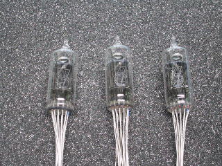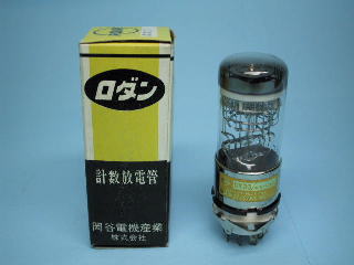 計数放電管デカトロンです。名前の通り、放電を利用して数を数えると同時に表示します。つまり、カウンターICとニキシー管の機能を一つで行うものです。これ1本で10カウントしますから、必要桁数カスケード接続すれば10進のカウンターができます。しかし最大動作速度は数10KHz程度です。私の通った高校の物理教室にあった古いガイガーカウンタにこれが使われていました。(想像ですが)どんな物か知りたくて長らく捜していたのですが、最近新品が1本100円で売られているのに遭遇して10本も購入してしまいました。動作している所が見たくなって、おもちゃを作りました。