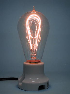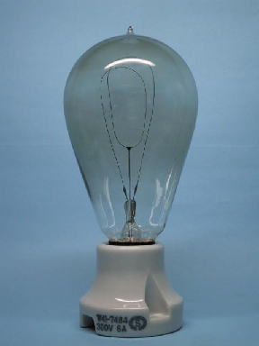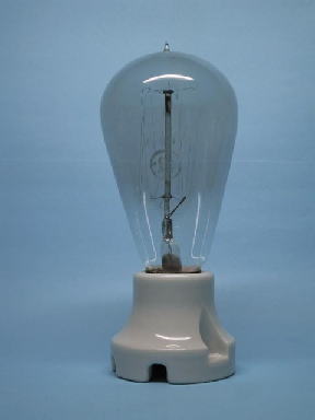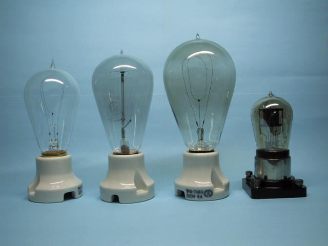 右は数年前エジソンの電球発明から100年を記念して、浅田電球製作所が製造したレプリカです。エジソン電球を忠実に復刻しています。カーボンフィラメントは温度が低く、フィラメント長も短いですからとても暗いです。その後フイラメントがタングステンになり、ステム排気化で危ないトップチップが無くなり、ガスが封入され、ダブルコイルフィラメントにより明るくなり、内部つや消しによって眩しく無くなって、今日の白熱電球が完成しました。(といっても昭和初期の頃ですが。)