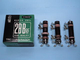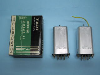 トリオ(現ケンウッド)製の真空管ラジオ用コイルです。左は2バンド高周波1段増幅用コイルパック、右は中間周波トランスです。3連バリコンと真空管、トランスがあれば高1付きスーパーラジオが作れます。