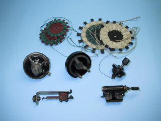 昭和初期のラジオに使われていた部品です。上段はスパイダーコイルでアンテナコイルと同調コイルで一組です。中段はレオスタットと電源スイッチ。下段はレシーバジャックとグリットリークです。