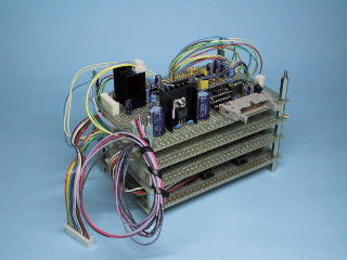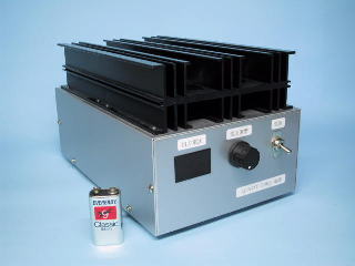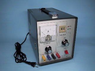 出力電圧は0〜20V、出力電流は0〜2A、電圧はデジタルSWで1Vステップで設定し、ボリュームで微調整します。電流リミッタ値はボリュームで連続可変できます。オペアンプ用に±15V出力もあります。定電圧出力、定電流出力のいずれの状態であるかは、LEDのインジケータで表示されます。仕様的には市販電源に見劣りしません。定電流出力時の発振などに苦労しましたが何とか解決し(確か解決したと思います。昔の事で忘れましたが。)、定電圧出力から定電流出力にスムーズに移行します。昔の作品なのでケース加工やパネルレタリングが非常に凝っています。(回路図はこちら)