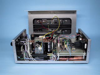内部の様子。結構綺麗に作ってあります。50Hzの元は12.8MHzのTCXOを分周して作ります。フィルターで正弦波とし、アンプで増幅してトランスを駆動します。(ブロック図と回路図の一部はこちら)アンプは23Vで動いていますが、この電源は20V3AのACアダプタジャンクを23Vに改造し、2台パラレルで供給しています。つまり電源の供給能力は100W程度あります。この23Vへの改造がまた失敗で、効率が低下し発熱がひどくなりました。最近のノートパソコンなどに使われているスイッチングレギュレータタイプのACアダプタは大変高効率で小型化されており、フイードバック抵抗をいじって電圧を変えると動作がおかしくなります。従来の筐体の大きなスイッチングレギュレータは、10%ぐらい出力電圧変更しても殆どの場合問題ないのですが!。