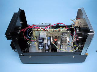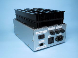 ごっつい放熱器!。アンプでトランスを駆動するため効率はとても低いのですが、放熱用にファンは使いたくなかったのでこんな大きな放熱器を付けてしまいました。そのため、とっても大きく重くなってしまいました。裏面は電気時計のタイマーとしての機能を使用するため、リレーにより元のAC100VからON,OFF出力するコンセントが付いています。