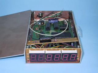 内部の様子。インジケータの表示部分と制御回路がかなりの部分を占めています。標準ロジックICで全てを作っているためであり、今なら1チップCPUで全て出来るでしょう。各回路ブロックを別々に作って組み合わせてあるため、基板サイズがばらばらで雑然とした感じがします。この後は回路規模が異なっても出来るだけ同じ基板サイズで作るようになりました。