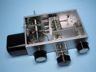 まず中波から短波まで6バンドでカバーする0-V-0のユニットを作り始めました。アンテナコイルは小さくするためトロイダルコアに巻き、大型のロータリースイッチで6バンドのコイルを切り換えます。検波管は昔の記事通りの6AU6(下の写真では取り外してあります。)、プレート負荷にはなかなか入手できなかったLUX製の100Hチョークコイルを使いました。写真の3個のつまみは左からバンドスイッチ、チューニング、アンテナとの結合度調整です。再生の調整をするスクリーングリット電圧調整ボリュームは外付けする予定だったので、このユニットには付いていません。バンドスイッチは富士通製?の大型ロータリースイッチを改造してアンテナコイルユニットと一体になっています。
