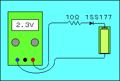 私なりに充電条件を検討します。充電電流は0.1C以下に抑えます。ニッカドなどを穏やかに充電するのはこのぐらいでしょうか?それと端子電圧の上昇に注意します。端子電圧が定格を越えるとガスが急激に発生するのでは?との推測からです。従って定電流充電ではなく、初めぱっぱの次第にちょろちょろ充電です。このように書くと難しいことをやるようですが、定電圧電源に電流制限抵抗と逆流防止ダイオードを付けただけの回路です。使用済みアルカリ乾電池を用意して実験です