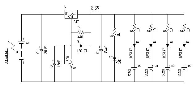充電電流が少ないこともあって、なかなか端子電圧は上がって来ませんが、怖い液漏れも起こしていません。充電後は、殆ど動かなかったモータが新品電池とはいかなくてもそれなりに動きます。起電力は回復するようです。一番怖い液漏れが起きないので、この条件で長時間充電してみることにします。ちょっとしか充電させないのに電源を動かしっぱなしにするのは気が引けるので、太陽電池と3端子レギュレータで充電回路を作りました。これなら、エコロジーです。