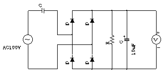 右の回路でCとRの値を変えて出力電圧を測定しました。負荷が変わっても取り出せる電流値はほぼ結合コンデンサの容量で決まっているようです。無極性コンデンサとしては1μFぐらいが適当で、これ以上になるとトランスを使った方が大きさ的には有利になりますから、数V,数十mA程度の負荷までが実用的な回路でしょう。しかし、トランス無しにDC電圧が取り出せるのは魅力的です。実用レベル開発品の電源周波数変換器のロジック用電源もこの回路で作りました。しかし、計算で部品定数を正確に求めるのは困難そうです。そういえば、トランスで変圧して整流した電源電圧も正確に見積もるのは困難だったことを思い出しました。いずれにしろ結構簡単で便利な回路なので、今後多用しようと思います。