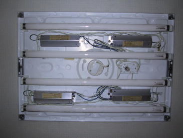 しばらく探していましたが、なんとなく部屋が暗い事に気が付きました。上を見上げるとインバータ照明の一部が暗いのです。カバーを外してみると電解コンデンサが破裂したとき特有の匂いがしました。果たして、4灯ある蛍光灯の内、1灯が点灯していません。どうやら1台のインバータが故障したようです。発火するような様子は無かったので、その日は放置しておきました。(右上が故障したインバータ)