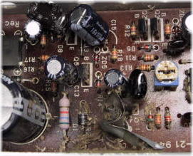 修理を始める前に、まず回路図を起こします。片面基板なので簡単です。デジカメでハンダ面の写真を取り、ソフトで左右を反転し画像の明るさ、コントラストを調節して印刷することで、部品面よりみた配線パターンが完成します。その上に部品を書きこむことで簡単に回路が読み取れます。