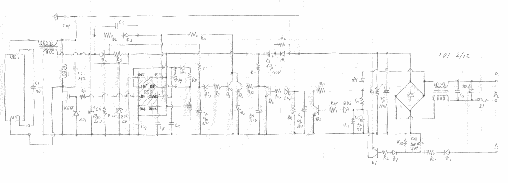 AC100V電源が入るとD1,C3を通じて555に電源が供給され発振が始まります。C3は充電し終えるまで(約0.5sec)電源を供給します。この間に蛍光灯の放電が始まり、トランスからD2を経て555への電源の供給が始まります。通常の動作時にはトランスから電源は供給され続けます。なぜこの様な回路になっているのか良く分かりませんが、蛍光灯を付けずにAC100V電源入れても最初のC3の充電時間しか555が動作しないので回路保護の為かもしれません。