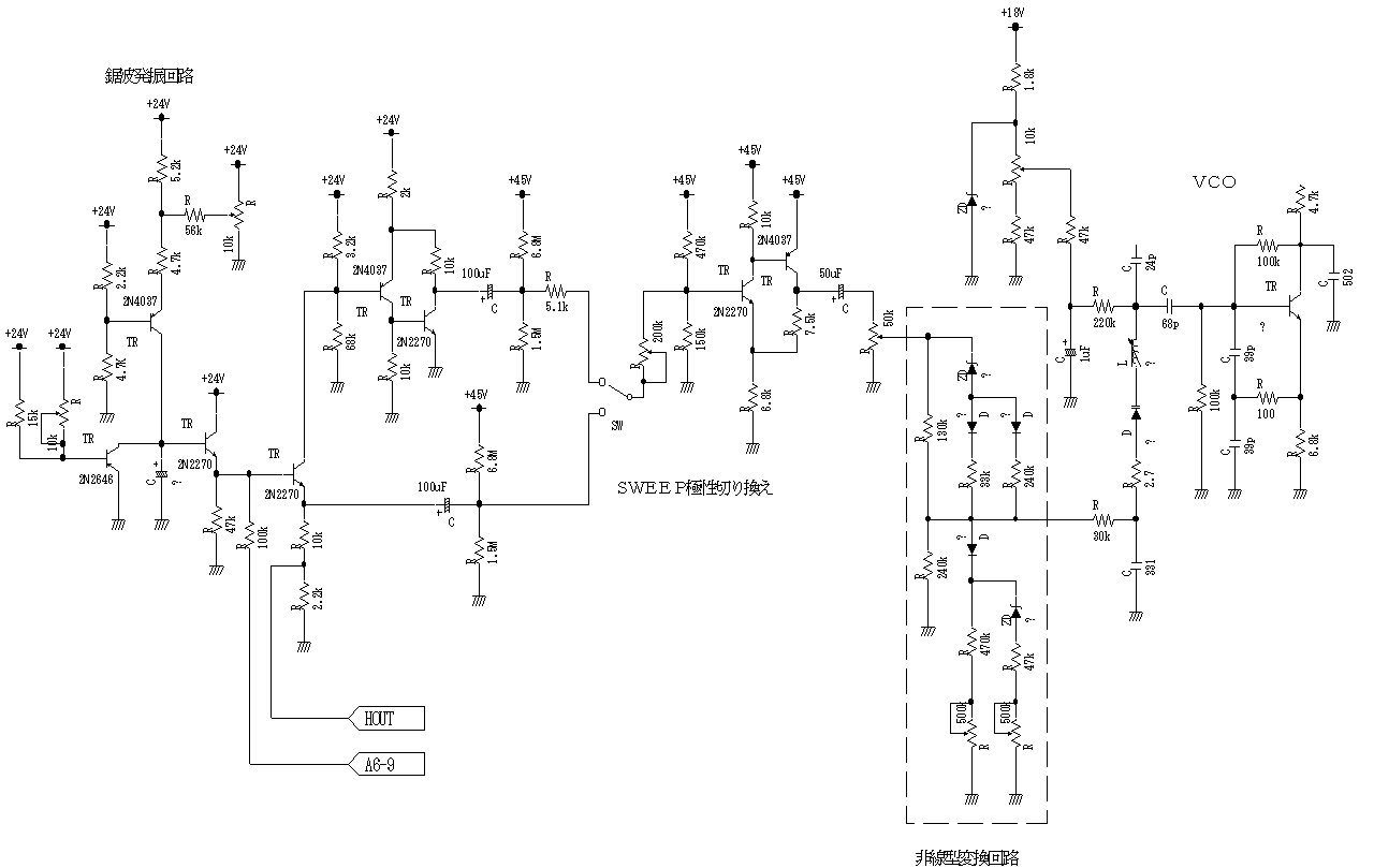鋸波発振回路とVCOの非線型補正回路部分です。SWEEP用の鋸波は途中で40Vp-pまで増幅されて、非線型補正回路に入ります。補正回路はダイオードと抵抗を複数巧妙に組み合わせて波形を圧縮し、バリキャップで発振するVCOの直線性を補正します。入手可能な部品のみで作るしか無いアマチュアには、こんな回路は実現困難です。最少の部品で目的を達成する、さすがはプロといったところです。