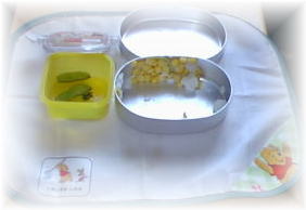 始めてのお弁当。ミッキー(のつもり)のおにぎり、海苔の付け方が難しくて・・・。