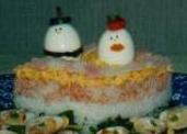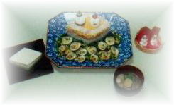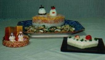 | 雛祭りのお献立 お雛祭り。我が家には女の子がいないけれど、 毎年雛祭りの献立を作って楽しんでいます。 子供の日と違って、お雛祭りは、平日なので、近所のなかよしママさんと、 1日掛かりで、お料理を…。 お献立は、大々毎年同じになってしまいます。 ![]() ひし餅風三色ご飯・はまぐりのガーリックロースト・菜の花のソテー はまぐりのうしお汁・三色ムース(苺・抹茶・ミルク) ・・・ムースはもっと合う組み合わせを思案中・・・ ご飯の上の、ゆで卵で作ったお雛様。 先生は、ひとりでできるもんの舞ちゃん。 結婚した年とか、その前とか古いメニューなので、確か初代舞ちゃん。 ![]() なかなかかわいいでしょう? しゃけ、しらす、青菜で、3色ご飯を作り、ひし形の型で押し寿司風に。 ひし形の型。牛乳パックを切って、それを使って、型を作ると抜きやすいです。 錦糸玉子を上に飾って、 縁を梅型に抜いた大根とハムのマリネでデコレーション。 お内裏様のえぼしは、キュウリに昆布を差し込んだもの。 昆布を細く切った帯をしめて。 お雛様は、プチトマトとブロッコリーのかんざし。 にんじんで作った扇子を持って貰いましょう。 ゴマの目としょうがのお口をつけたら出来上がり♪ ![]() |