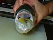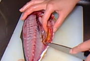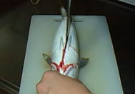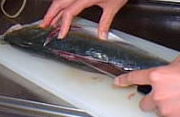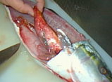 お気楽指導の下、念願の、魚の解体にチャレンジする彼と、バトンタッチした私。