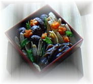 三の重(お煮しめ) お正月用のぷっくぷくのどんこ ごぼう・こんにゃく・タケノコ ねじり梅にんじん・矢羽根さや 今年は、八つ頭を貰いそびれてしまいました。 飾り切りにした残りのにんじんなどは、 細かく切って、五目おこわになります。 |