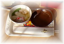 | 王子のお雑煮はね。 年末にディズニーランドで仕入れた、 ミッキーさんのお餅なんだよ。 もちろん、キティのかまぼこで・・・。 (でも最初、気付かなかったみたい…) |