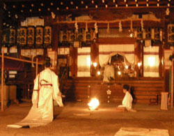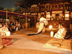 御神楽が厳かに菅公に奉納され幻想的 な雰囲気に包まれました。神事は夜、18時頃から始まり、月の光とともに篝火の下で、