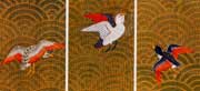 舞楽の青海波は二人舞で、名前の通り寄る波と引く波を表現した振りが数多く見られます。装束は絢爛豪華な物で、袍には波の模様と百羽あまりの千鳥の刺繍が施されています。舞人が左に右に揺れる様はなんとも心地よく感じられ、舞人が動くと袍も揺れ波に遊ぶ千鳥の光景が広がります。この舞は『源氏物語』の『紅葉賀』の章で、源氏と頭の中将が紅葉をバックに舞う場面で有名です。これに習い、青海波は紅葉盛りの庭で舞われるのが一番ふさわしいとされています。是非紅々と色付いた、秋めいた庭でこの優雅な舞を見てみたいものです。平安貴族の優雅な生活が垣間見れそうですね。ホゥ……、考えただけでため息です。。。