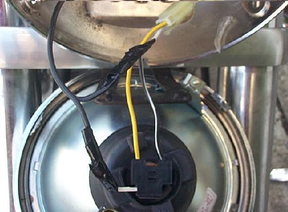 ヘッドライトケースを外すと電球のソケットから3本の線が出てるね。白、黄色、白黒。そのうちの白がどうやらロービームの配線やね。この白配線をちょん切った。またデイトナスイッチ先端のコネクタの部分をまたちょん切った。スイッチからは2本線が出ている(図の黒い配線)ので先程切った白配線と図のように接続する。接続部は後でテープ等を巻いて絶縁しておこう!ちなみにちょいとデイトナの配線が短いので延長配線が必要になるかも。
