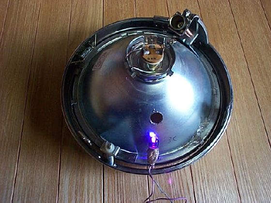 ライトケースにドリルで穴をあけ、青紫色に光る電球を付ける。