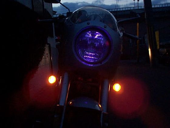ヘッドライトを消すと青紫色にほのかに光っている。