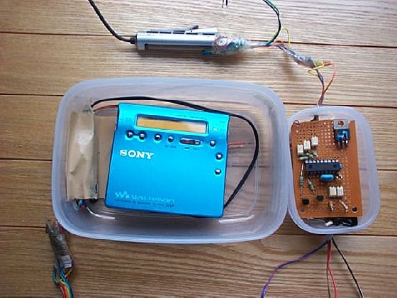 左側にあるのがMDウォークマン。これは圧縮録音して最大1本のMDで320分の録音ができるらしい。5時間以上やで!これはロングツーリングにもってこいだね。右側がラジオ&MDチェンジャー 、コントローラである。MDのリモコンから配線を引き出しマイコンで制御する。再生、次の曲、前の曲の動作を1個のボタンのクリック回数でコントロールできるようになる。また12Vのバッテリーから3Vの電圧も作り出す。それぞれ弁当箱に入れて防水し、サイドバックにしまっておいてる。使い心地は今のところ音飛びもしないしええ感じ。このユニットでますます楽しいドライブができるね。