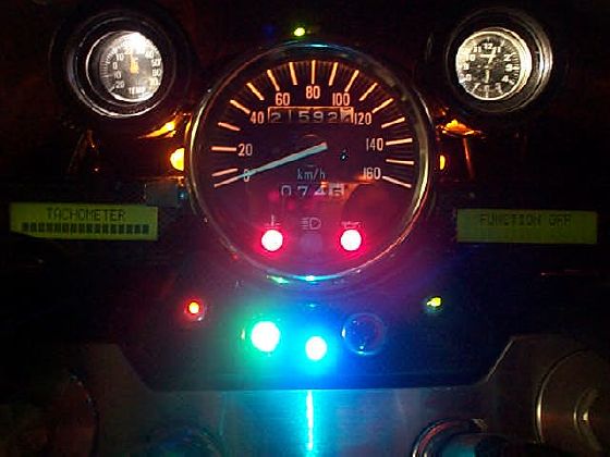 ニュートラル、ウィンカーランプの部分に赤、緑、青に発光するランプを付けたけど、今のところただ光るだけで何も意味はない。