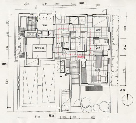 | 一階平面図 一階は母親のスペースと、共用である洗面所、浴室、和室を設けました。 母親のスペースは、玄関→居間→寝室→廊下→玄関という流れを作り 将来この内側の壁に手摺を設けることにより、生活がスムーズに営まれる ことを考慮しました。 |