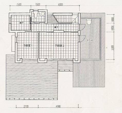 | 三階平面図 三階は子供(3人)のスペースとし、まだ小さい男の子二人の部屋は共用と していますが、将来区切れる様に入り口を2箇所設けました。この階に設けた テラスは生活用のテラスで、洗濯物を干したり、靴を洗ったりします。 |
