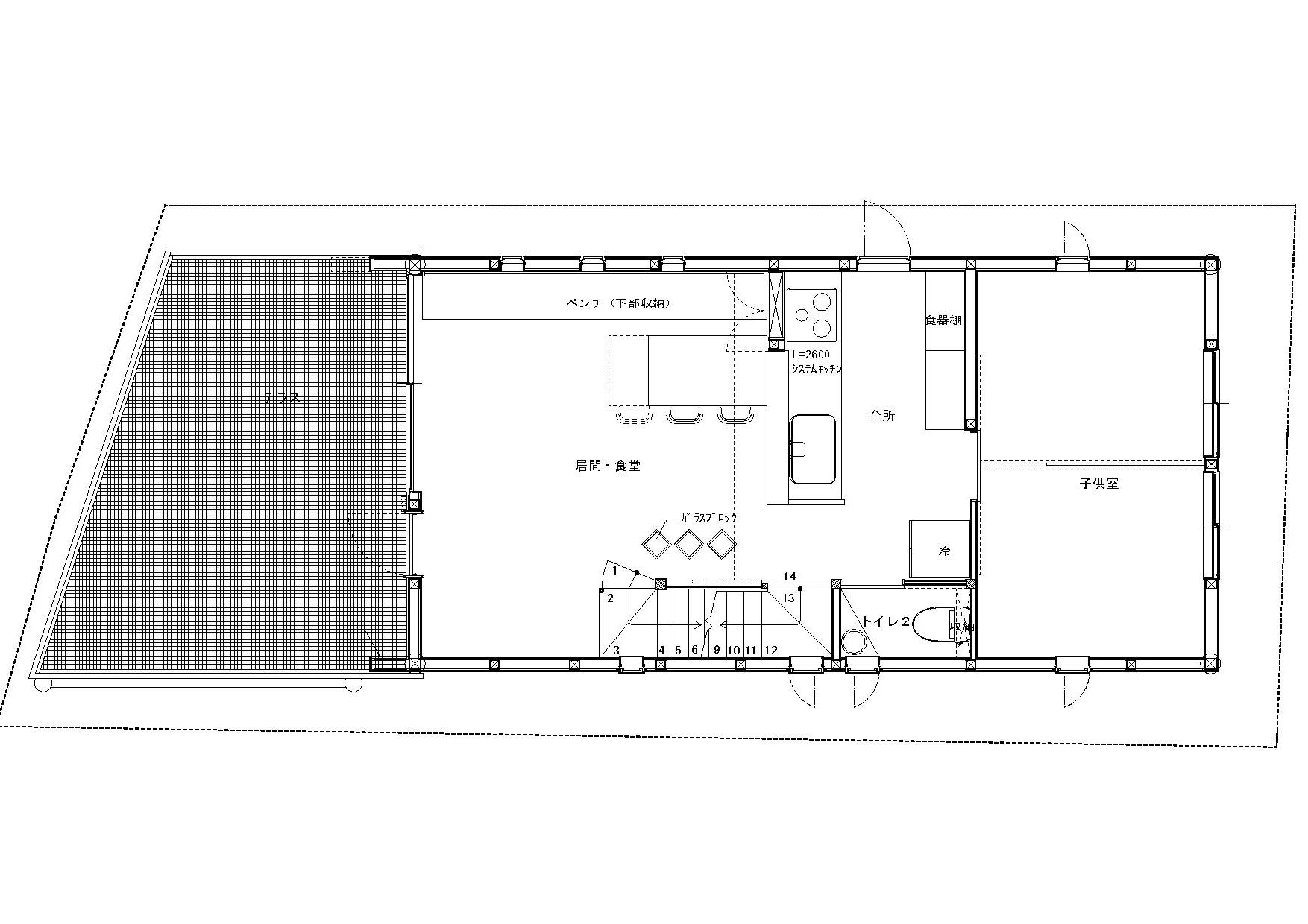 | ニ階平面図 2階は生活の中心となる居間、食堂、台所と子供室を設けました。天井を吹き抜けとし空間がロフトへ繋がることにより面積以上に広がりを感じることを心掛けました。直接階段からのアプローチになりますが、冷暖房を考慮してガラス戸とガラスの嵌め殺しで区画をし、視覚的にはオープンな感じにしました。又、ベランダは建築面積に算入されないように全面グレーチングとしました。このベランダが部屋に広がりを提供してくれます。 |