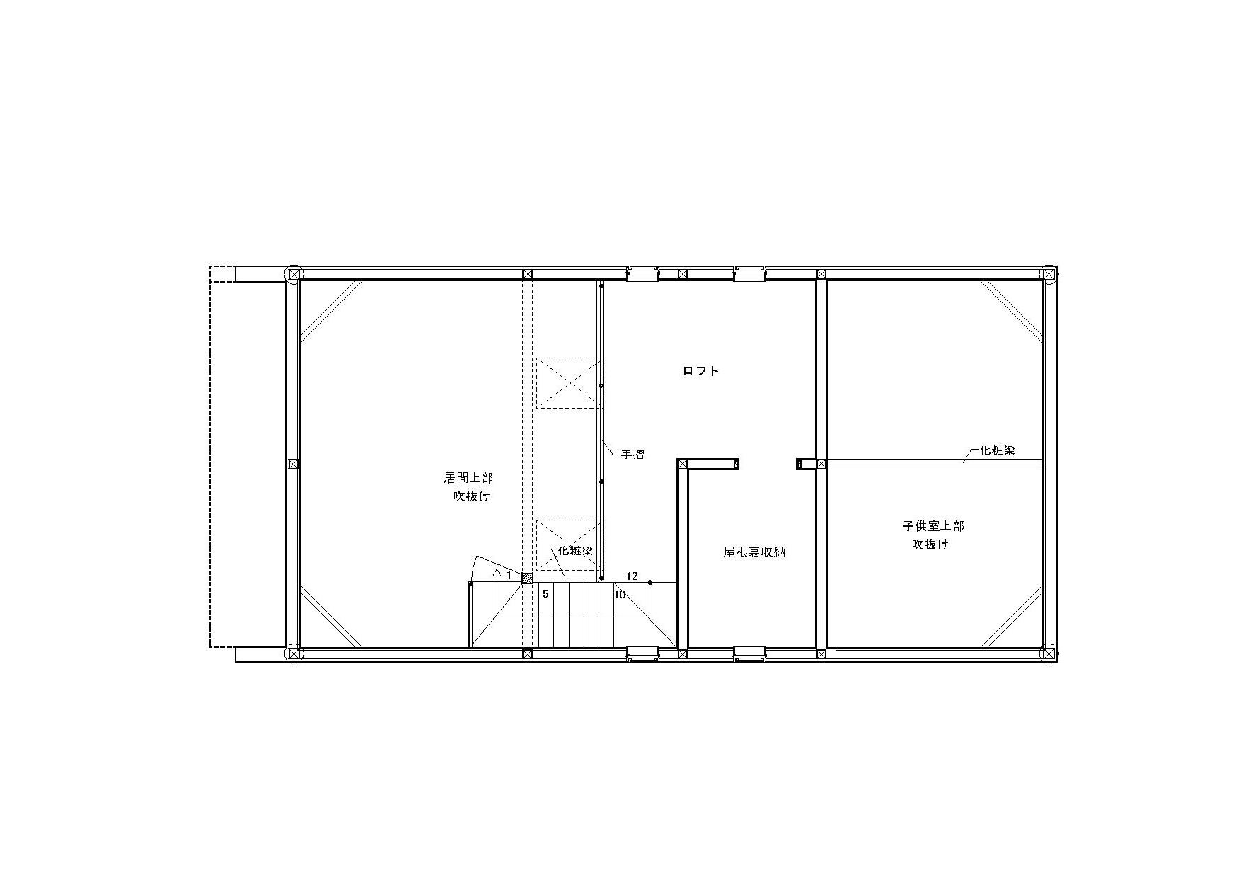| ロフト階平面図 ロフトは収納と書斎の機能を担っています。又、トップライトは開閉式ですが、コストを下げる為に手動式としこのロフトから安全に操作が可能です。 |