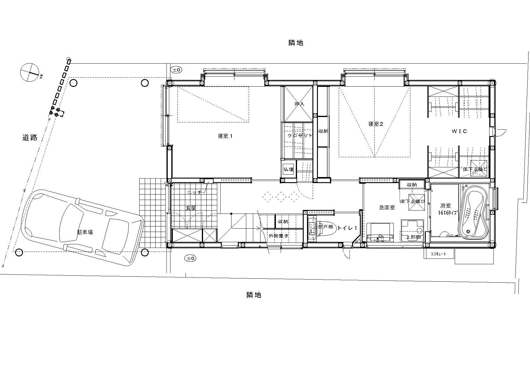 | 一階平面図 1階は親と夫婦の寝室の個室と、洗面所、風呂の水周りを設置しました。夫婦寝室にはオープンのクローゼットを繋げ、時間をかけて打ち合わせをして無駄の無い収納としました。狭小住宅ではありますが、生活に必要十分な間取りを心掛けました。 |