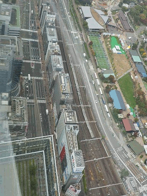 ハルカスウィングガーデン(貸し菜園)から見たハルカス オオサカアートベイタワーが見えます 大阪城を発見。割と低いですね。 けっこうな高層ビル群。見事に高さがそろっています。 キワキワのビル群と環状線・・ですが、まるでNゲージのジオラマ見たいです。 「てんしば」は、今日はイベントは有りません。動物園もすいていました。 <北側>正面少し右に大阪城があります