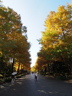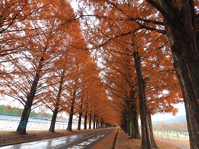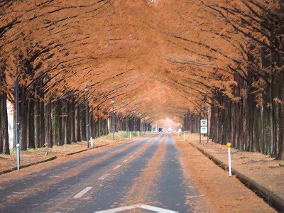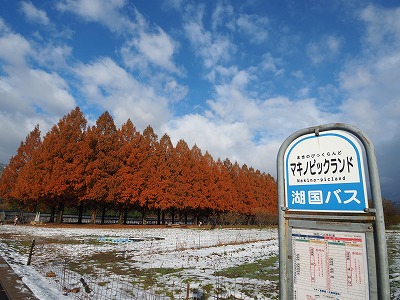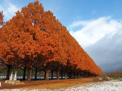 滋賀県マキノ町にある約2.4キロのメタセコイヤ並木。500本が植えられていて今が紅葉の終わりごろと言うので行ってきました。朝6時に出発して、8時半に到着。まわりには雪が残り、北陸道は木之本から北はチェーン規制が出ています。まだタイヤを履き替えていないので、北上はあきらめて石山寺に寄りました。