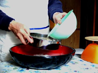 B、水(粉が500gだったら半分の数字の約250cc)を少しずつ入れて混ぜる